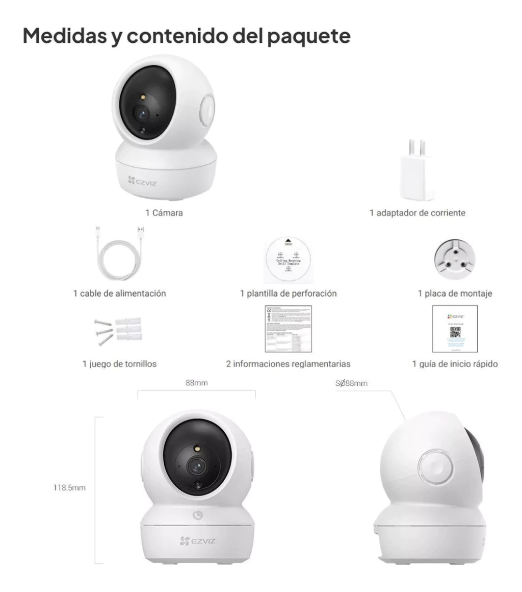 Incluye: » Cámara IP Wifi Full HD » Cargador de 220V » Cable de Red » Soporte para pared » Tornillos y tarugos para instalación » 30 días de grabación en la nube sin cargo. Garantía de 1 año.