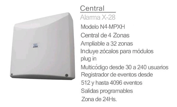 Central de Alarma 4 Zonas modelo N4-MPXH de X28 Alarmas. Incluye dos carteles disuasivos sin cargo! (Uno de X-28 y otro de nuestra empresa) · Central de 4 zonas con tecnología MPXH · Ampliable a 32 zonas (8 particiones de 4 zonas) · Incluye zócalos para módulos plug in · Multicódigo desde 30 a 240 usuarios · Registrador de eventos desde 512 y hasta 4096 eventos Incluye también cartel disuasivo de X28 Alarmas GARANTÍA DE 5 AÑOS.