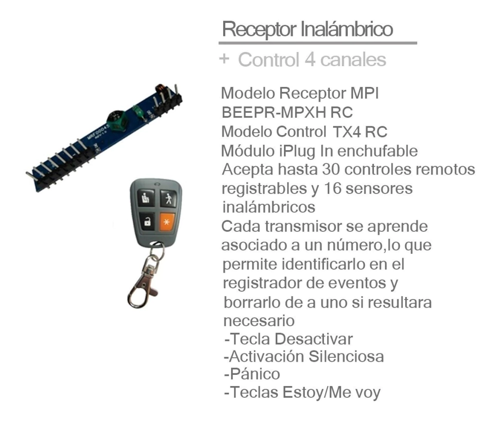 » Central 4 zonas. Incluye modo Estoy-Me voy (N4-MPXH) » Teclado led (T4M-MPXH) » Sensor de movimiento cableado con rótula incorporada autoadhesiva (MD50R). (Aclaración: Si desea puede cambiar el modelo por uno que sea antimascotas) » Sensor de apertura para puerta o ventana cableado autoadhesivo blanco (SMCB) » Sirena exterior de potente sonorización (S52A) » Sirena interior con led de emergencia (S16L-MPXH) » Receptor inalámbrico (MPI BEEPR-MPXH) » Control remoto de 4 canales (TX4R) » Llamador por red movil 2g a 4g compatible app celular (MPI COM30-MPXH) » Batería de reserva 12v 7ah.