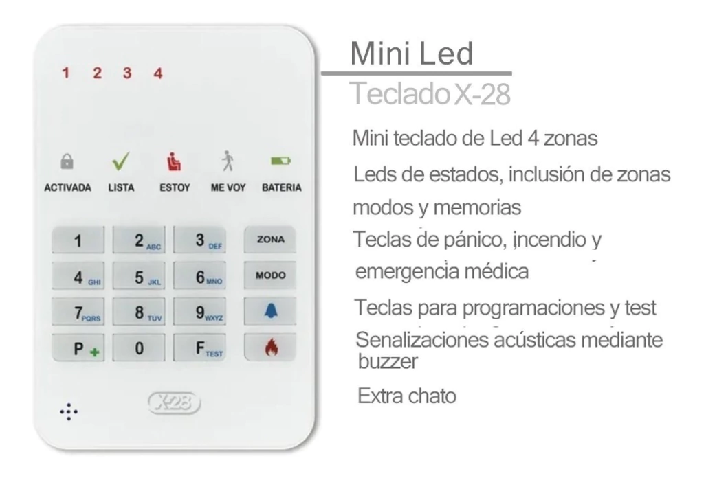 Mini Teclado Ultra Fino Led 4 Zonas de X28 Alarmas (mod. T4M-MPXH) · Mini teclado de leds de 4 zonas · Extra chato · Leds de estado, inclusión de zonas, modos y memorias · Teclas de pánico, incendio y emergencia médica · Teclas para programaciones y test · Señalizaciones acústicas mediante buzzer GARANTÍA DE 5 AÑOS.