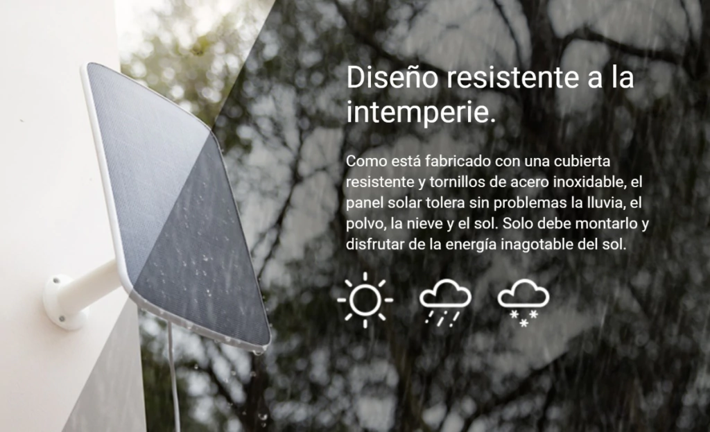 Consiga un mayor rendimiento aun para su cámara autónoma EZVIZ gracias a la solución de celdas de silicio monocristalina. - Al contar con una carcasa durable y tornillos de acero inoxidable, el panel solar resiste la lluvia, el polvo, la nieve y el sol sin problema. Tan solo tiene que instalarlo para disfrutar de la energía continua del sol.