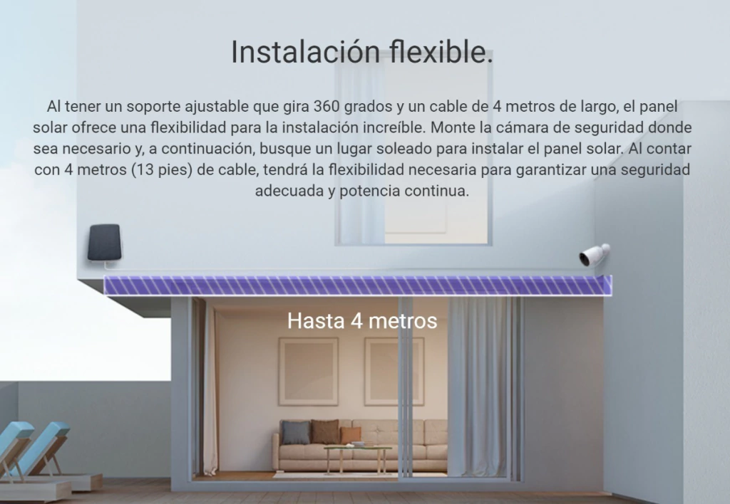 Cuenta con un soporte ajustable que gira 360º y un cable de 4 m de largo, el panel solar ofrece una flexibilidad sorprendente. Instale su cámara de seguridad donde la necesite y encuentre un lugar soleado para instalar el panel solar. El cable de 4 m le brinda la flexibilidad necesaria para ubicarlo comodamente y obtener una gran seguridad y energía continua.