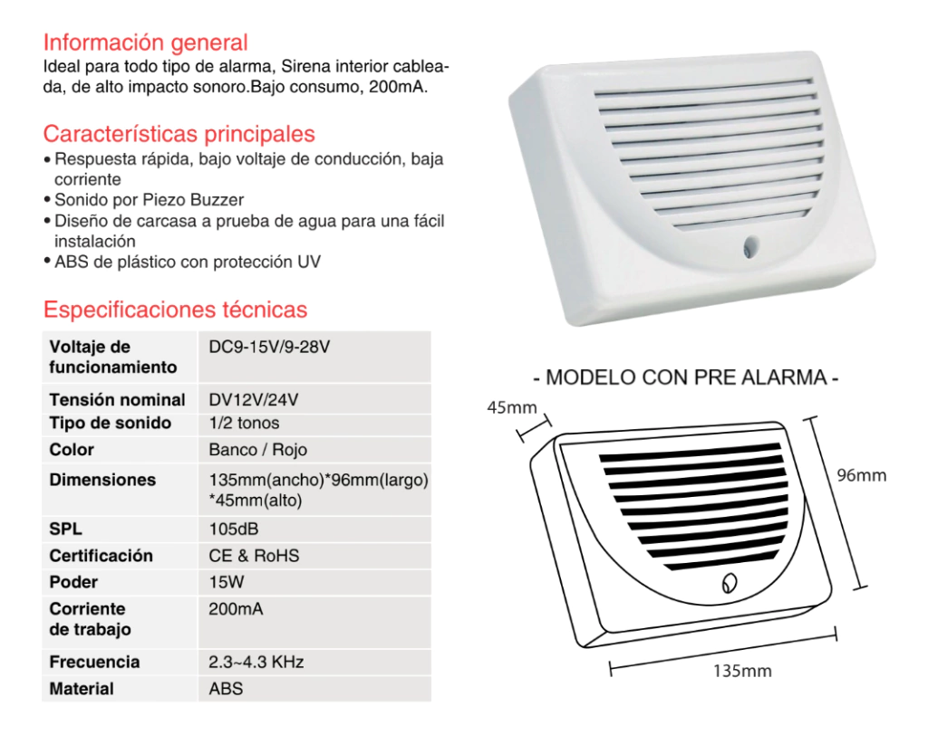 SIRENA DE INTERIOR PIEZOELECTRICA CON PRE ALARMA TAMPER SEGURIDAD COMPATIBLE CON TODOS LOS PANELES DE ALARMA DEL MERCADO ESPECIFICACIONES · 1 tono · ABS · 12v · 105dB · Incluye Tamper.